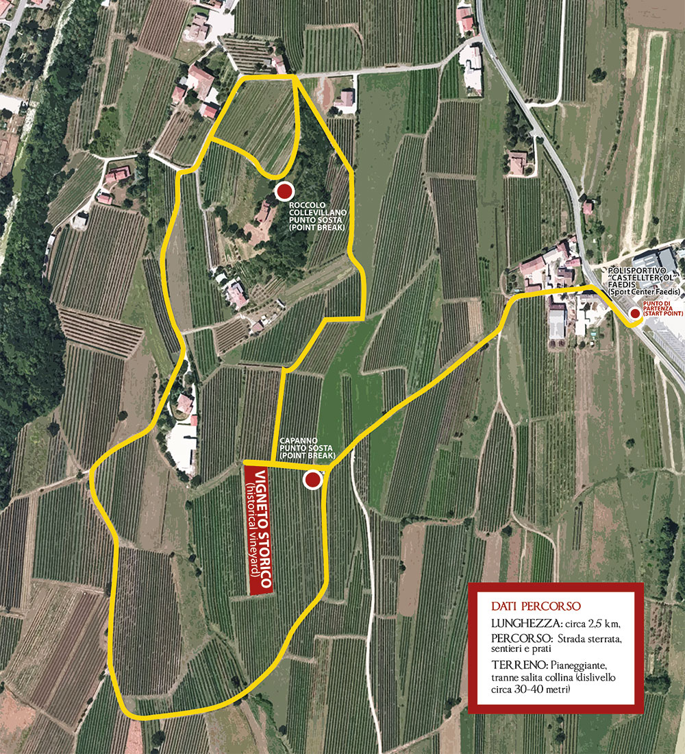 Due punti caratterizzano questa passeggiata: il “Vigneto Storico” della famiglia Zani, un vigneto messo a dimora alla fine dell’800, uno spaccato della viticoltura friulana, che produce ottime uve ancora oggi, e dal quale si è potuto recuperare il vitigno autoctono “Refosco di Faedis”. La collina con il Roccolo e la Chiesetta di Santa Maria, una delle più antiche del territorio, dal quale si può ammirare un bellissimo panorama.